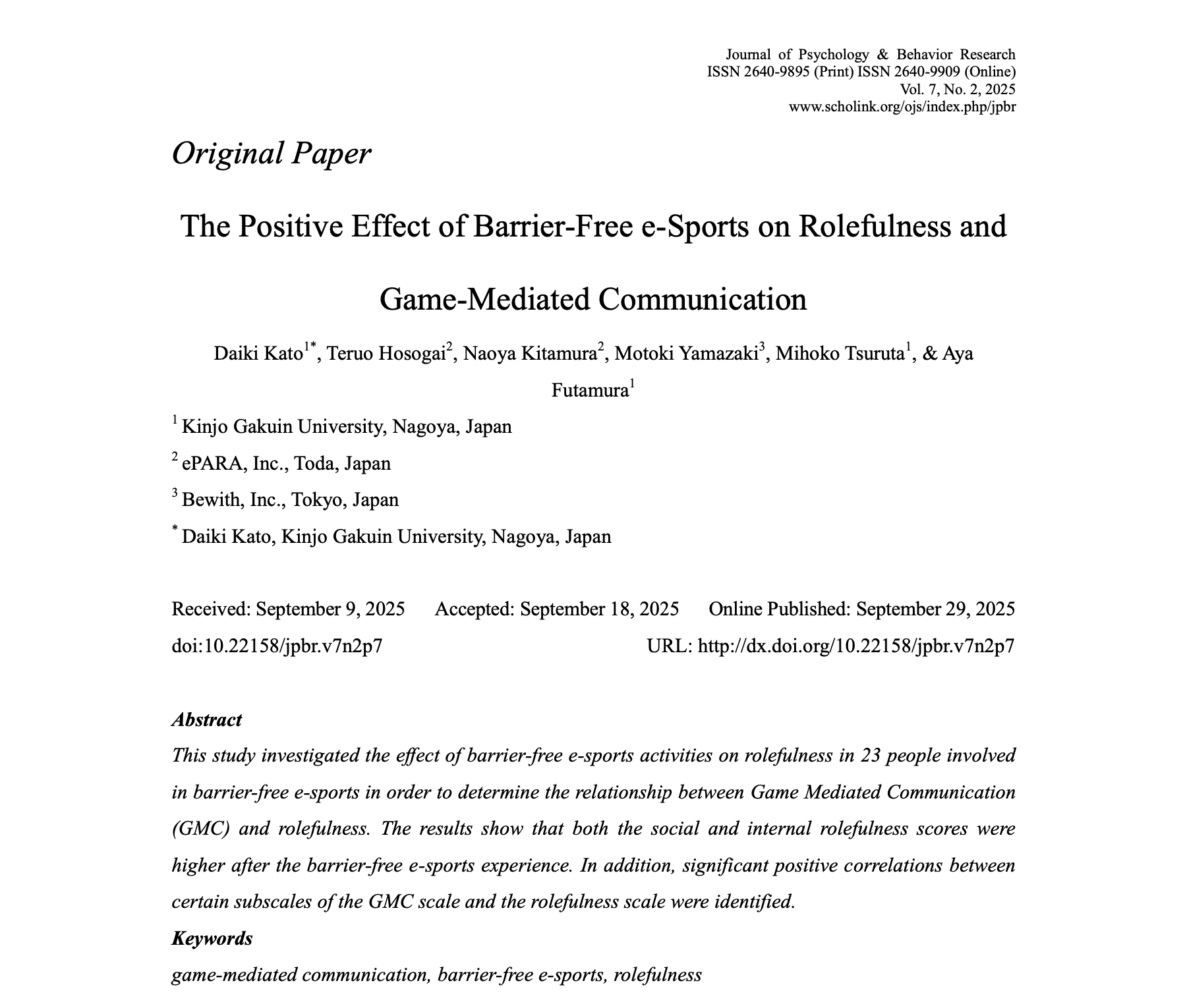 金城学院大学 多元心理学科 加藤大樹教授・鶴田美保子准教授・二村彩准教授と、株式会社ePARAのチームによる共同研究が、米学術誌Journal of Psychology & Behavior Researchに掲載されました。