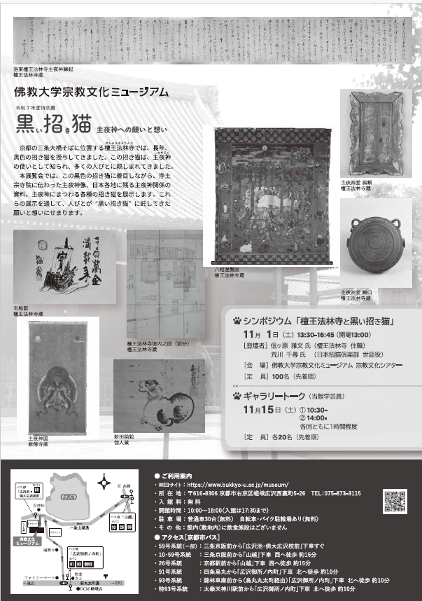 佛教大学宗教文化ミュージアム(京都市右京区)は、黒い招き猫に着目し、2025年10月23日(木)から11月29日(土)まで、特別展「黒い招き猫 主夜神への願いと想い」を開催いたします。本展では、檀王法林寺(京都市東山区)で授与され、人びとに親しまれてきた黒い招き猫と、その背景にある夜を守護する神「主夜神(しゅやじん)」の信仰に焦点をあて、人びとの祈りや託された願いに迫ります。会期中には檀王法林寺住職や専門家を招いたシンポジウムや学芸員によるギャラリートークも行い、多角的にテーマを掘り下げます。