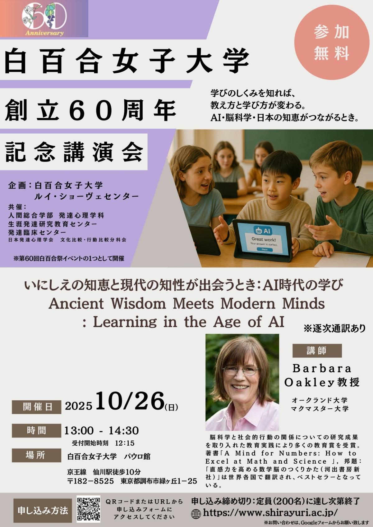 また、同日にはBarbara Oakley教授による講演会「いにしえの知恵と現代の知性が出会うとき:AI時代の学び」も開催。自己調整学習・アクティブラーニング・ニューロダイバーシティをキーワードに、学習スタイルへの誤解を解くヒントとしてもらうことを図る。