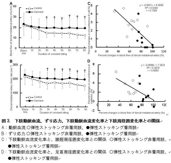 これらの結果は、日常生活における長時間の座位姿勢保持が、特に下肢の血行動態を悪化させ、血栓症発症リスクを増大させる可能性を示唆しています。その一方で、着圧の低い、着用しやすい弾性ストッキングの着用は、血栓症発症リスクを軽減させる可能性があることを示しました。
