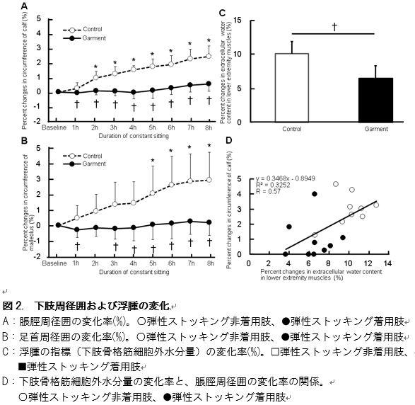 連続8時間の座位姿勢保持により、ふくらはぎと足首の周径囲は増大し(図2A、2Bの〇)、下肢の浮腫が認められました(図2Cの▢)。また、下肢浮腫の変化率と、ふくらはぎ周径囲の変化率との間には、有意な正の相関関係が認められました(図2D)。この結果は、下肢周径囲の座位姿勢保持による増大は、下肢浮腫に由来するものであることを示しています。