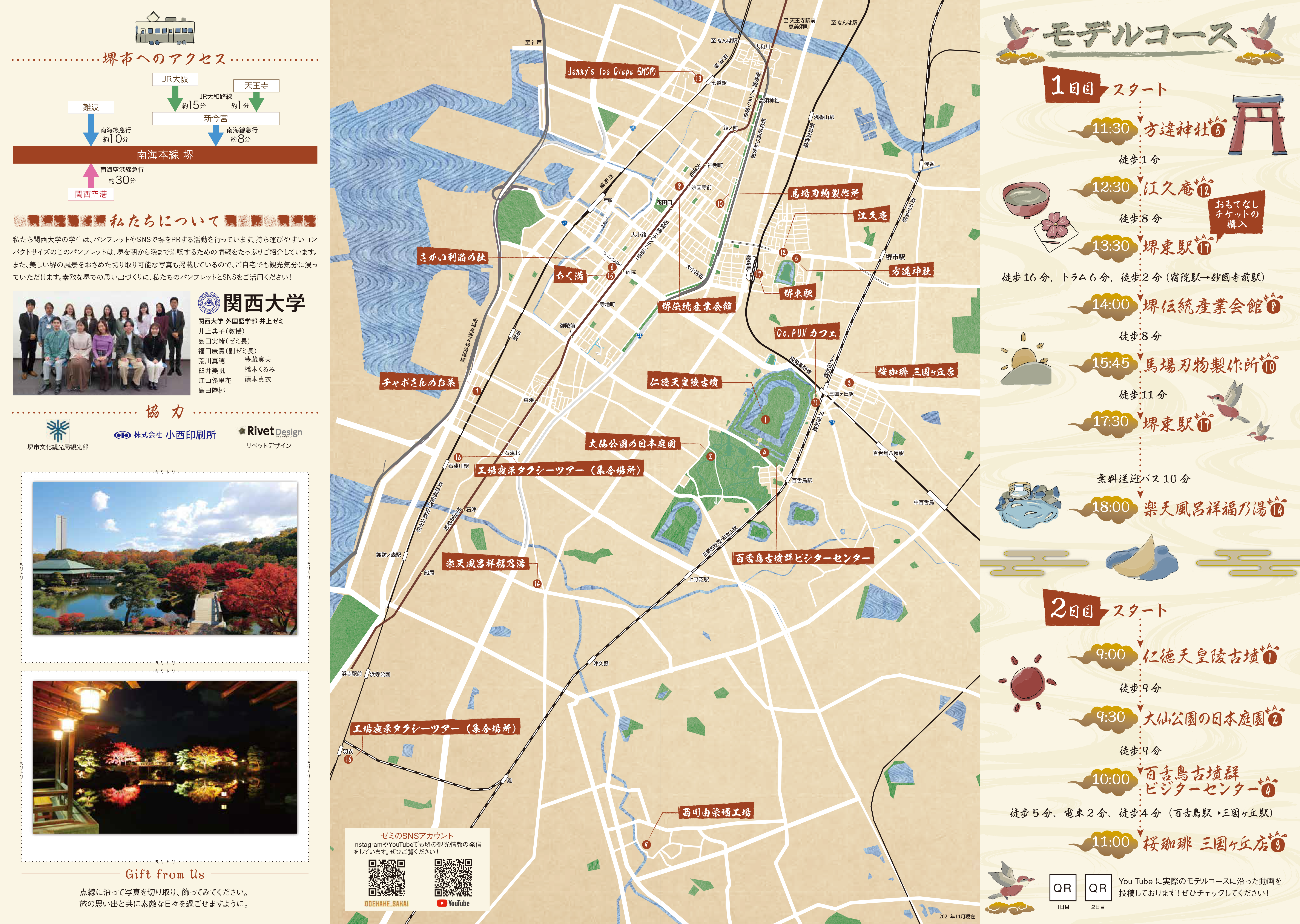 関西大学外国語学部の井上典子ゼミでは、堺市との地域連携事業としてインバウンド産業の支援プロジェクトに取り組んでいます。活動3年目を迎える今回は、「一日中楽しめる堺」をコンセプトに、古墳や伝統産業、グルメ情報などの堺市の魅力を詰め込んだパンフレット&動画(日本語・英語)を制作しました。