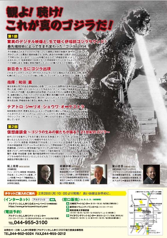 日本映画大学(川崎市麻生区)は5月3日(火・祝)、地域の芸術祭「アルテリッカしんゆり2022」の一環として、同区のテアトロ・ジーリオ・ショウワにおいて「ゴジラ」シネマコンサートを開催する。当日は映画『ゴジラ』1954上映と、それに合わせたサウンドトラック全曲の生演奏を実施。終演後には「仮想座談会~ゴジラの生みの親たちが語る21世紀のゴジラ~」もおこなわれる。