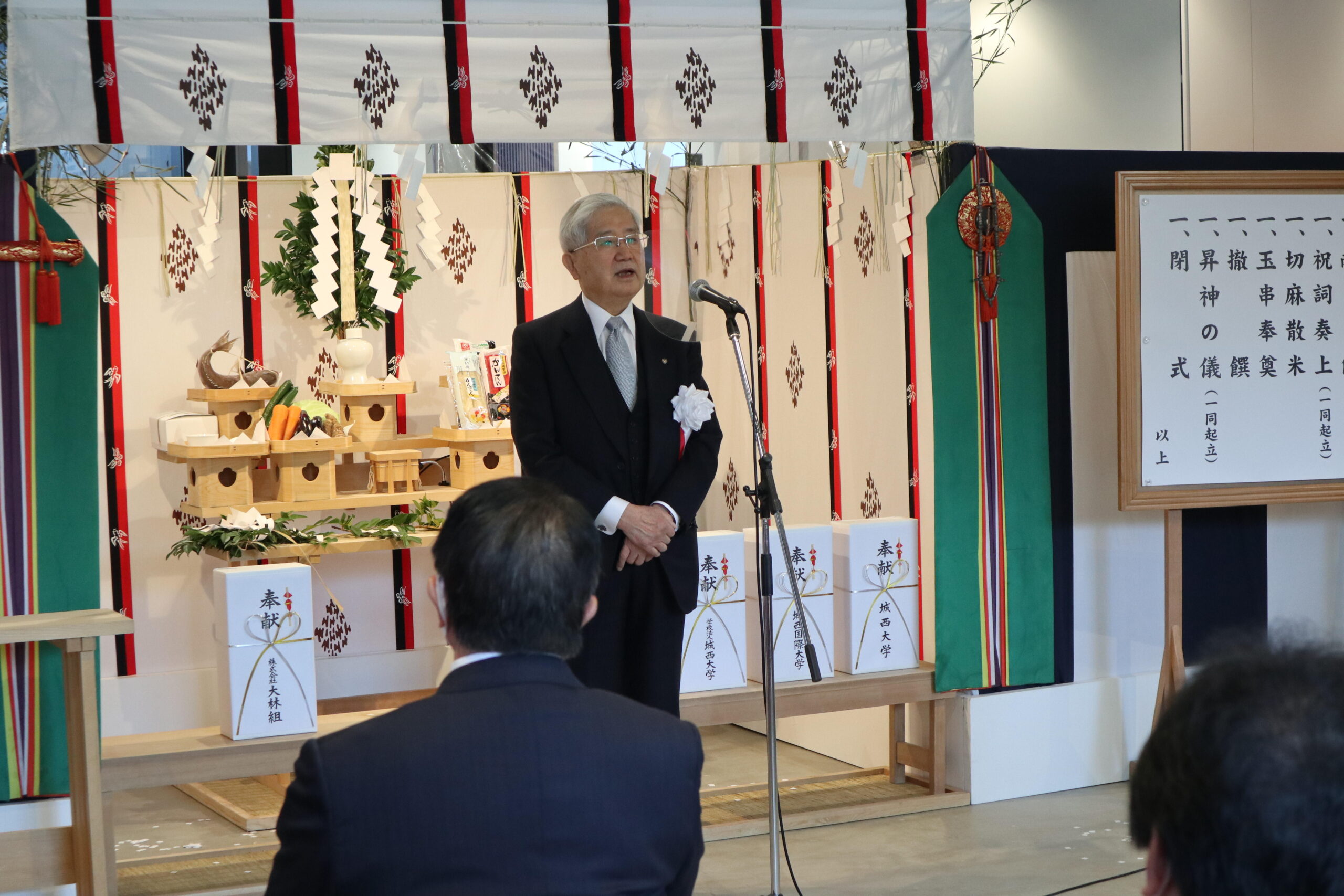 竣工式には上原明理事長、城西大学(埼玉県坂戸市)の藤野陽三学長、城西国際大学(千葉県東金市)の杉林堅次学長、城西短期大学(埼玉県坂戸市)の草野素雄学長らが、工事関係者とともに出席しました。神事の後、建築主を代表して上原理事長が「新2号棟は演劇の授業やグループディスカッションなどに適したフリーアクセスの教室がたくさんあると同時に、学生が寛げるスペースも確保しています。地域の方々との交流の場としても活用し、経験と視野の広い学生が育つことを期待しています」と挨拶しました。