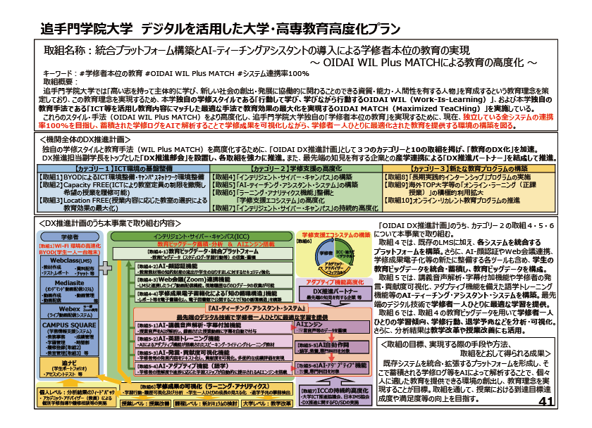 「統合プラットフォーム構築とAI–ティーチングアシスタントの導入による学修者本位の教育の実現~OIDAI WIL Plus MATCHによる教育の高度化~」