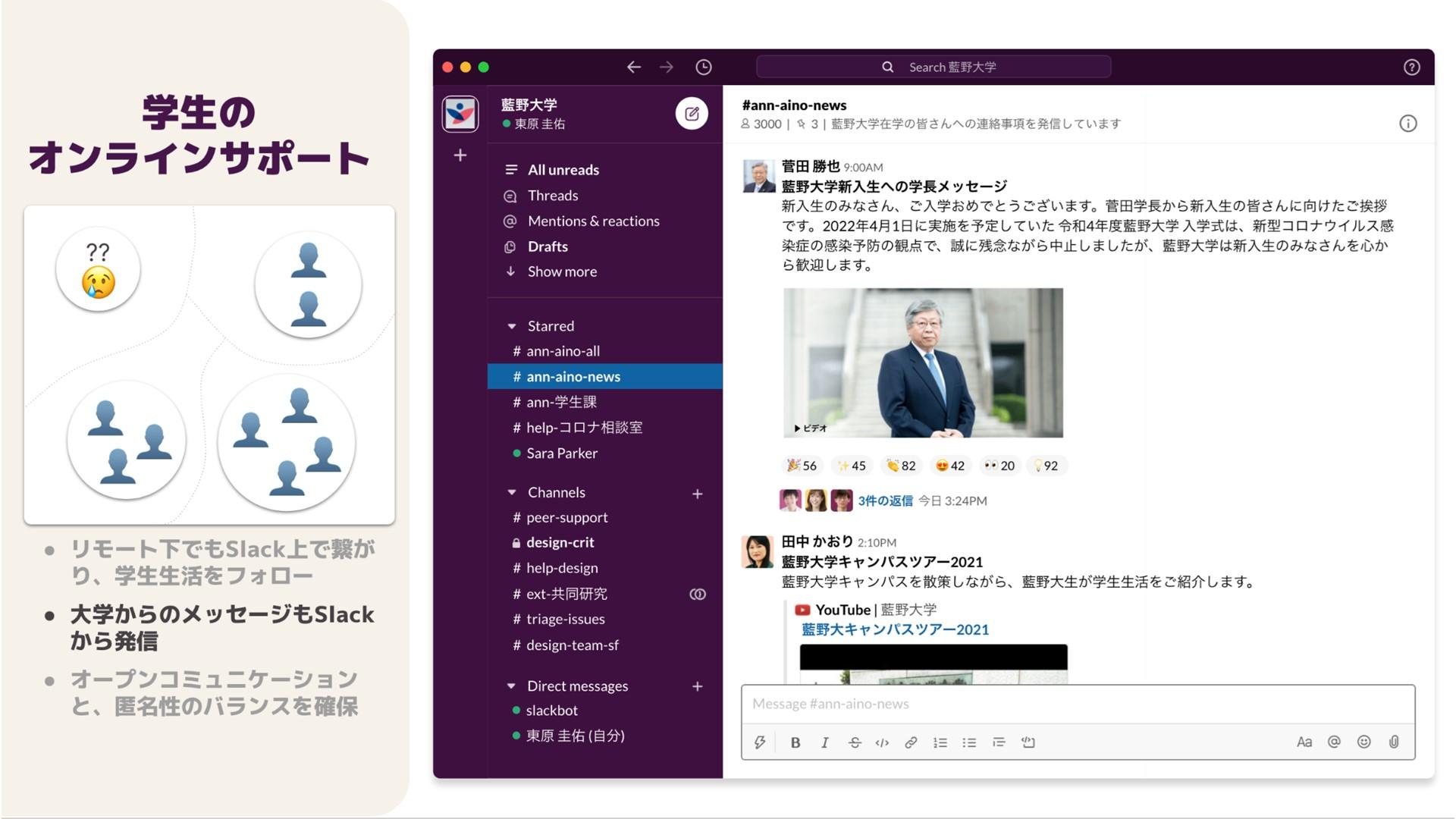 学内や卒業生、保護者、外部パートナーとのアクセスが電話やメール、アプリなど多種多様なシステムが混在している現状を、コミュニケーションのプラットフォームをSlackに一元化することで、アクセスの円滑化、働き方の変革を図ります。