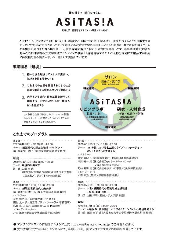 愛知大学は2020年、文部科学省私立大学研究ブランディング事業の一環として「越境地域マネジメント事業 ASITASIA”アシタシア”(明日のくに)」を発足。同年10月から「アシタシアサロン」を開催している。