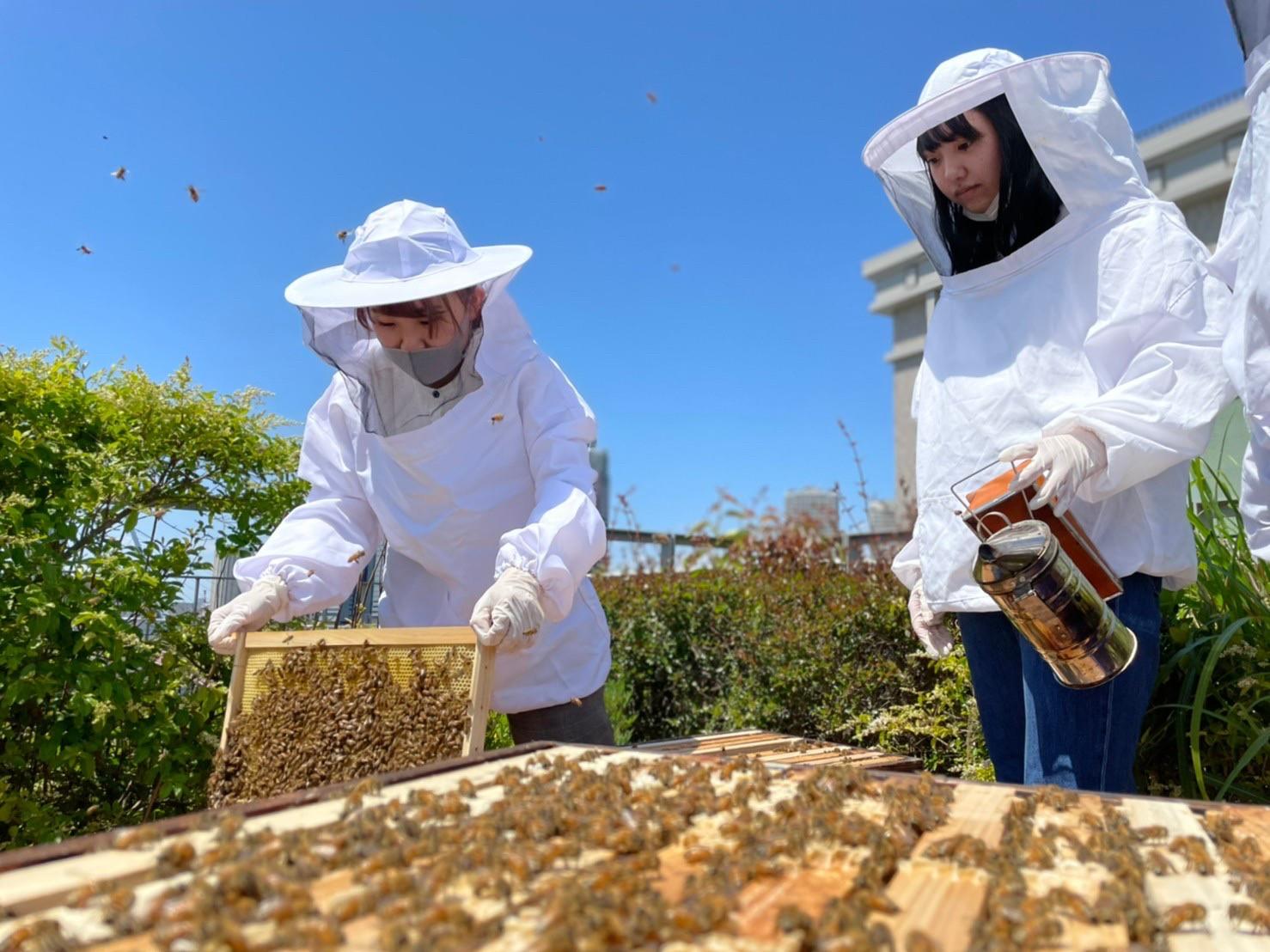 養蜂活動チーム「Rooftop bee」の学生8人が主体となって取り組み、昨年コロナ禍でも週1回の巣箱の点検を欠かさず、約50kgのはちみつを採蜜しました。