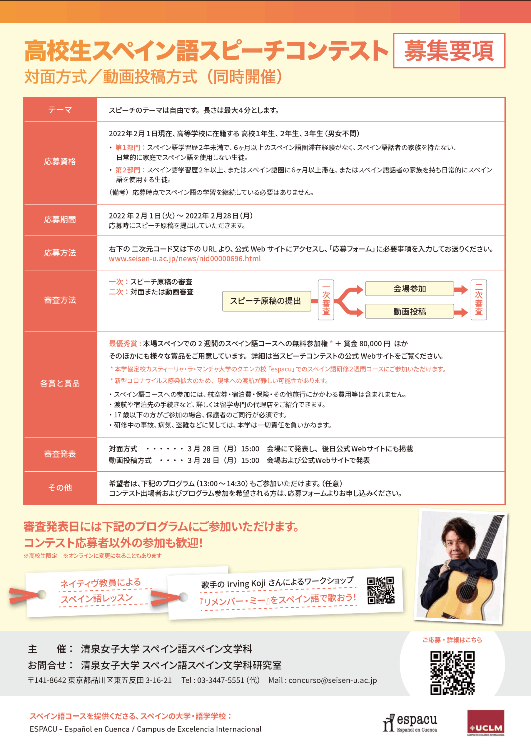 なお、審査発表日の3月28日(月)には下記のスペイン語プログラムを開催。スピーチコンテスト応募者以外の参加も可能となっている(高校生限定)。