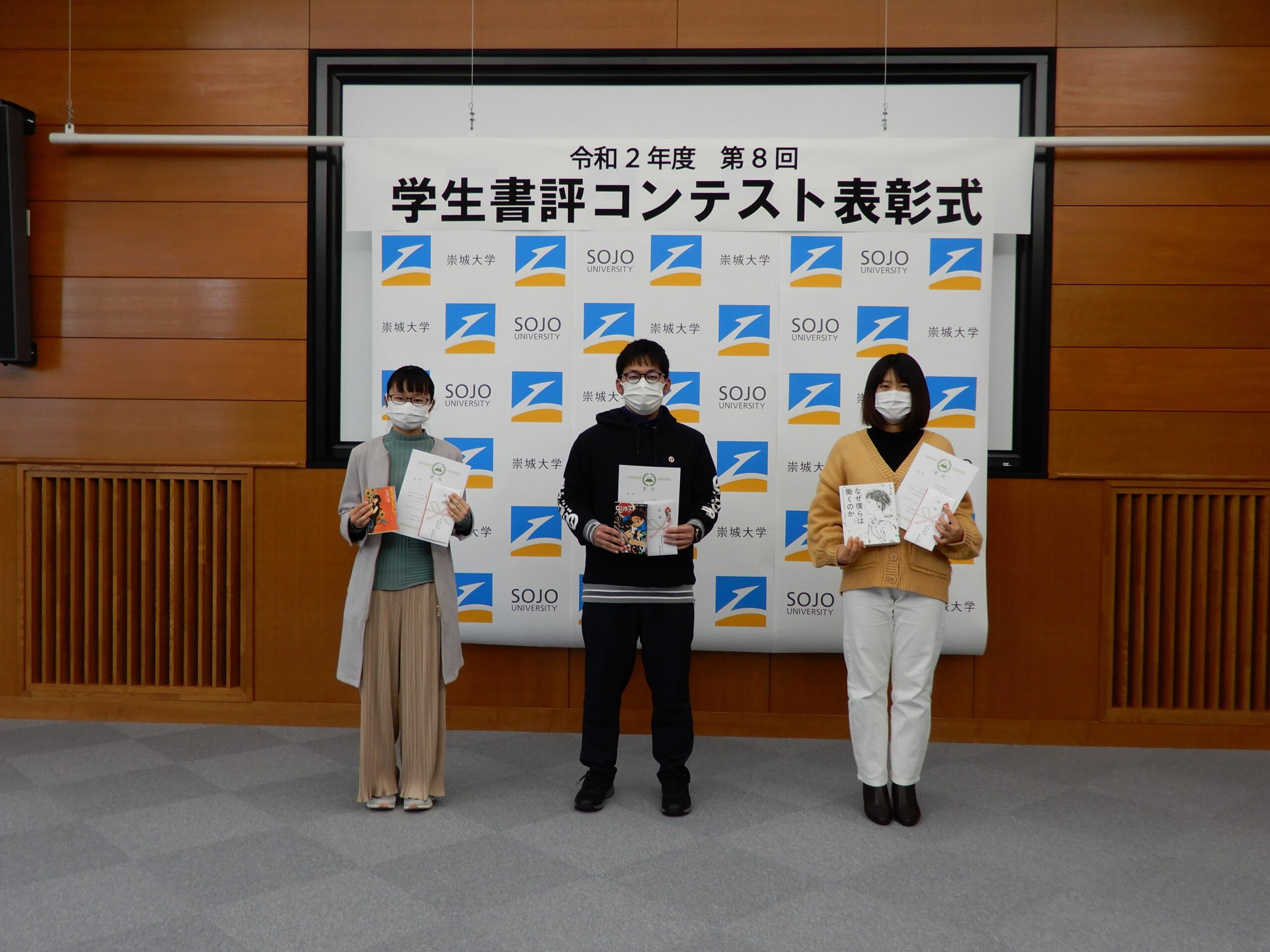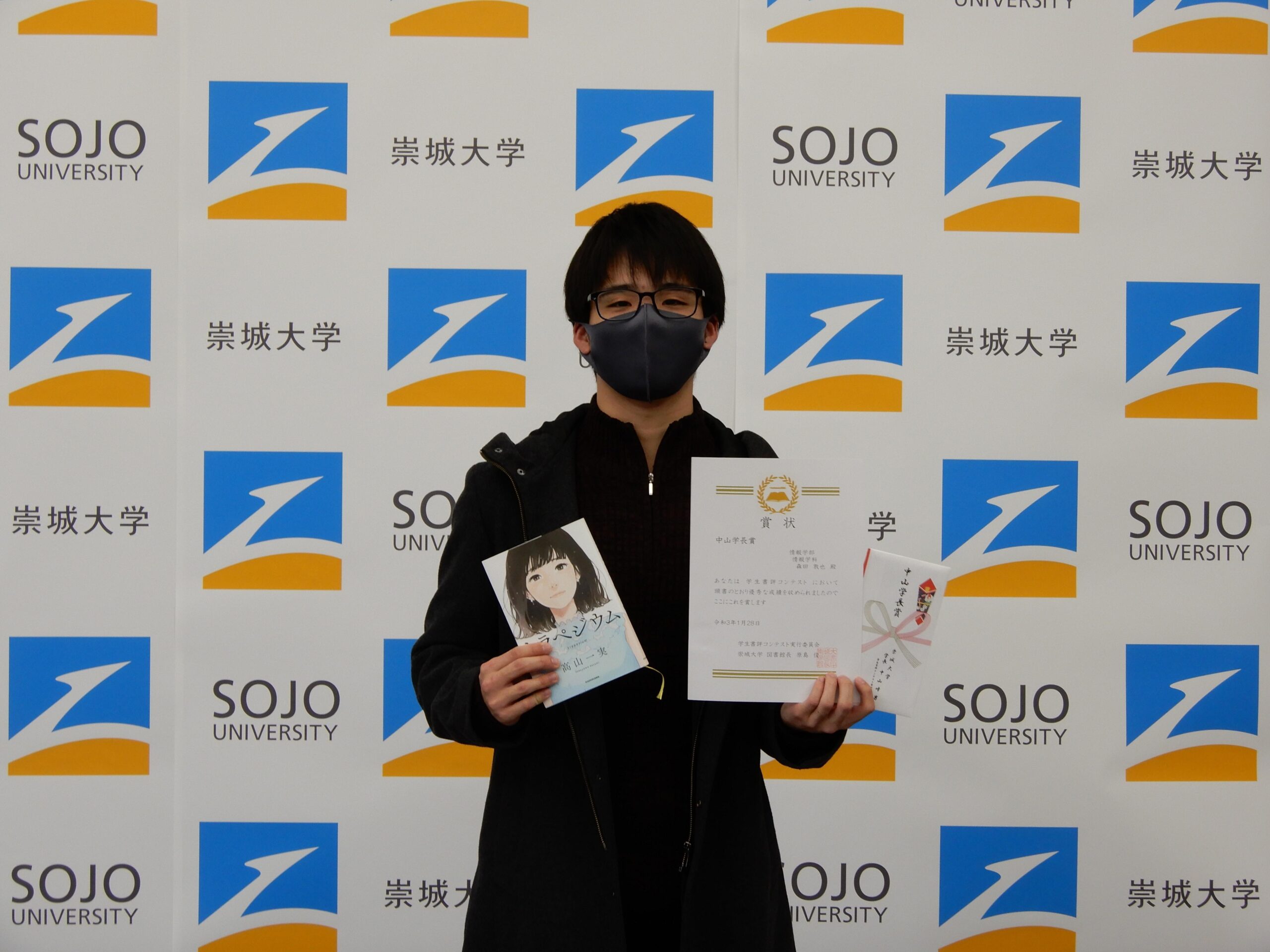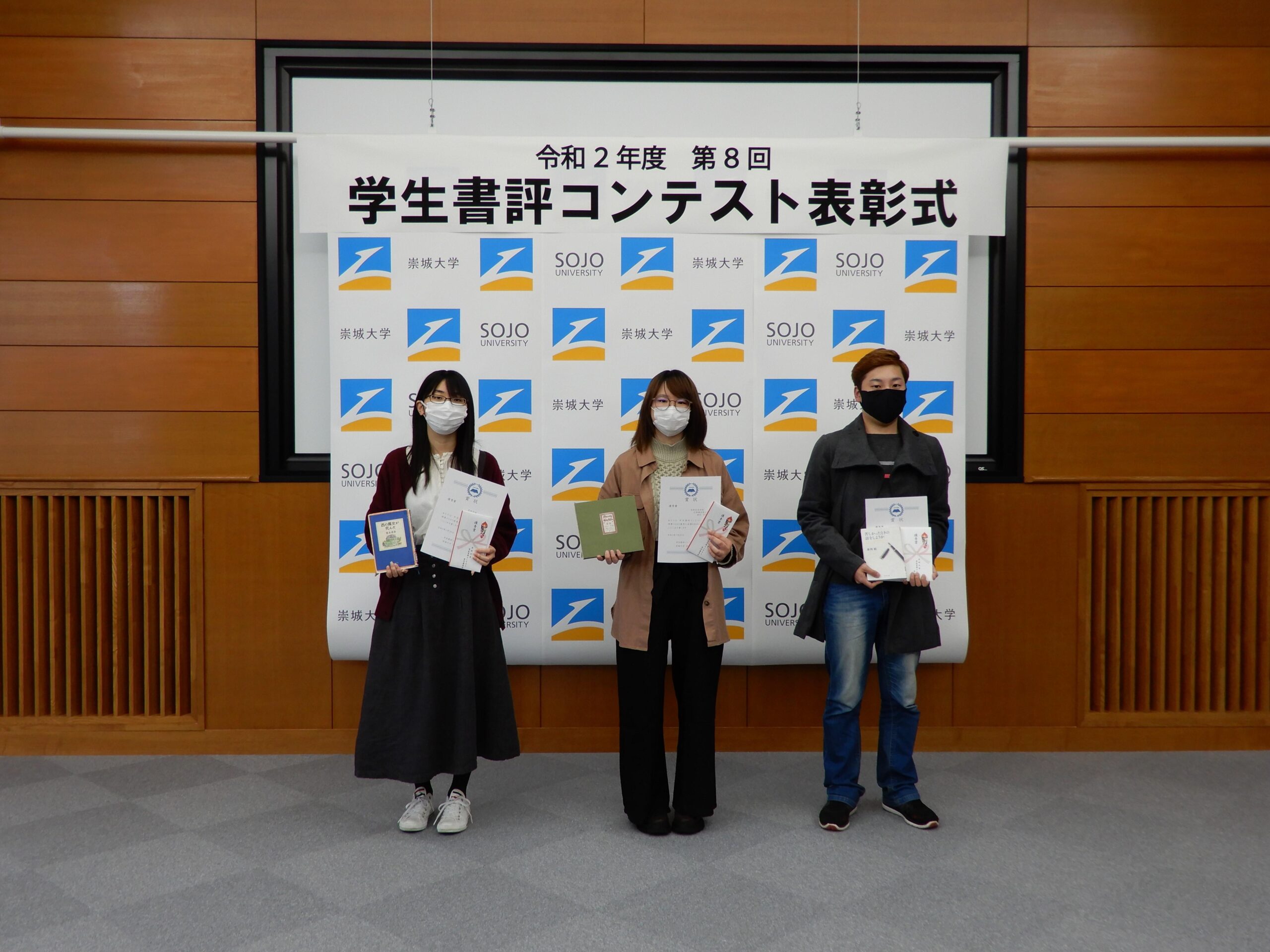今年度は、昨年度を上回る133名、134篇の応募があり、1次審査で13篇の作品を選出し、厳正なる審査の結果、学長賞1名、優秀賞3名、佳作5名が受賞致しました。表彰式では賞状と副賞が渡されます。また、入選作品は崇城大学図書館ホームページに掲載し、図書館内に展示いたします。