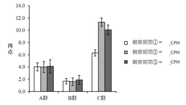 C群の女性において、 観察期間(1)よりも観察期間(2)、(3)の方があがりました。