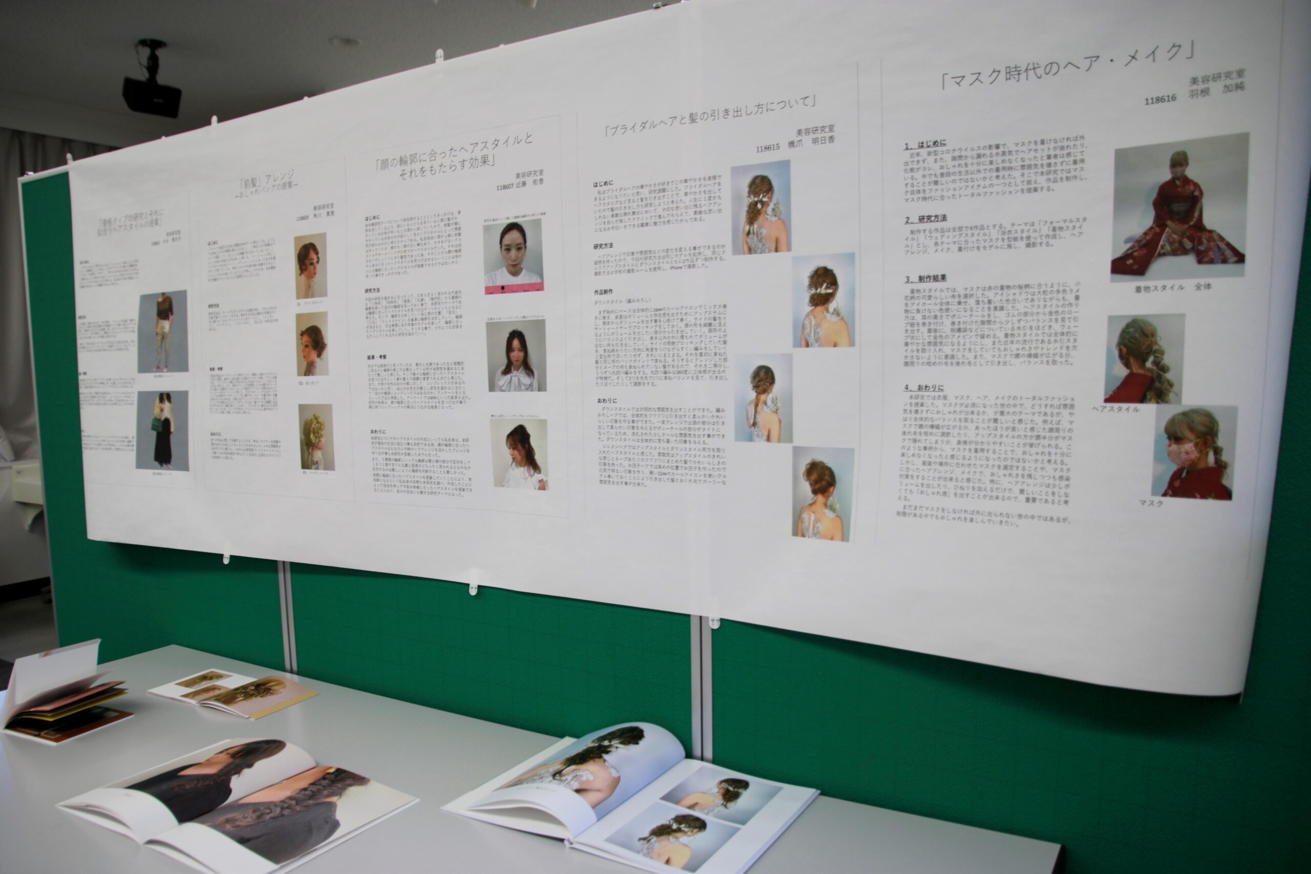 「卒業制作展」では、学生が制作したドレスをはじめヘア・メイク、ネイルアートのディスプレイ、化粧品の開発、色彩、美容整形、SDGs、ジェンダーフリー、日韓比較、着物リメイク、マスクなどの様々な観点から研究した論文のパネル展示などが並び、「よそおい」について究めた88名の4年間の集大成を目にすることができます。さらに「卒業論文発表会」では、制作展で展示した自身の研究や作品の成果のプレゼンテーションが行われます。学生は、各研究室(12研究室)の指導の下、素材、縫製、服飾史、心理学、生活デザイン、ファッションビジネス、メイクデザイン、美粧学、身体社会学、化粧科学などについて様々な研究成果を発表します。