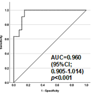 乳癌脳転移との関連が報告されているマイクロRNA15種類を、脳/肺/肝/骨単独再発した患者の乳腺原発巣上で発現比較を行ったところ、hsa-miR-155-5pが脳単独再発患者で有意に発現が上昇していました。(図1)また、hsa-miR-155-5pの発現は有意な脳転移再発予測能を示しました。(AUC=0.960) (図2)