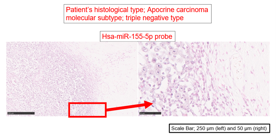 ● In situ hybridizationによって、hsa-miR-155-5pは乳腺原発巣の癌部に均一局在していることが示された。
