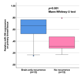 ● さらなる検証で、乳癌無再発群との比較では、脳単独再発群においてhsa-miR-155-5pの発現が高い傾向が見られた。(p=0.081)