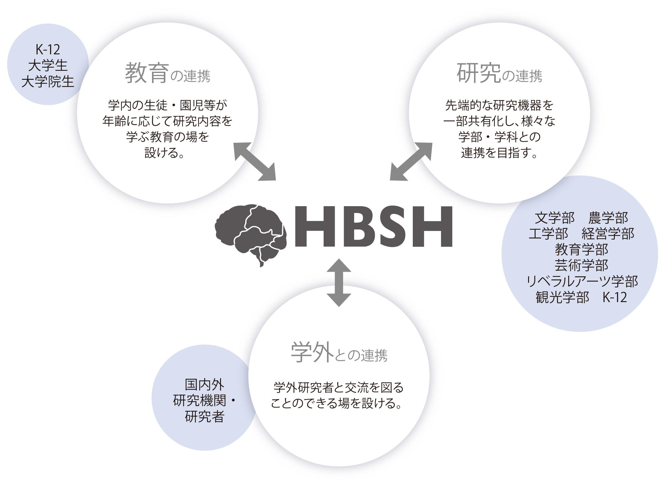 ・コンセプトは、学内のヒューマンサイエンス研究リソースの集約と「教育・研究・社会」と連携する開かれた研究拠点。