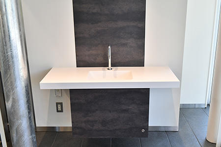 新型コロナウイルス感染症対策として、共用部には自然換気システムを導入。エントランスの風除室には手洗い器を設置しました。また1階ロビーの受付上部には、人体に有害な波長をカットし、有人環境でも使用可能な抗ウイルス・除菌技術「Care222(R)」を搭載した紫外線照射装置を設置。この他にも手が触れる機会の多い部分に接着した銅繊維シート、個室ブースに設置した光触媒除菌機、活性酸素を発生させる光触媒塗装などで、利用者の安全・安心の確保に努めています。