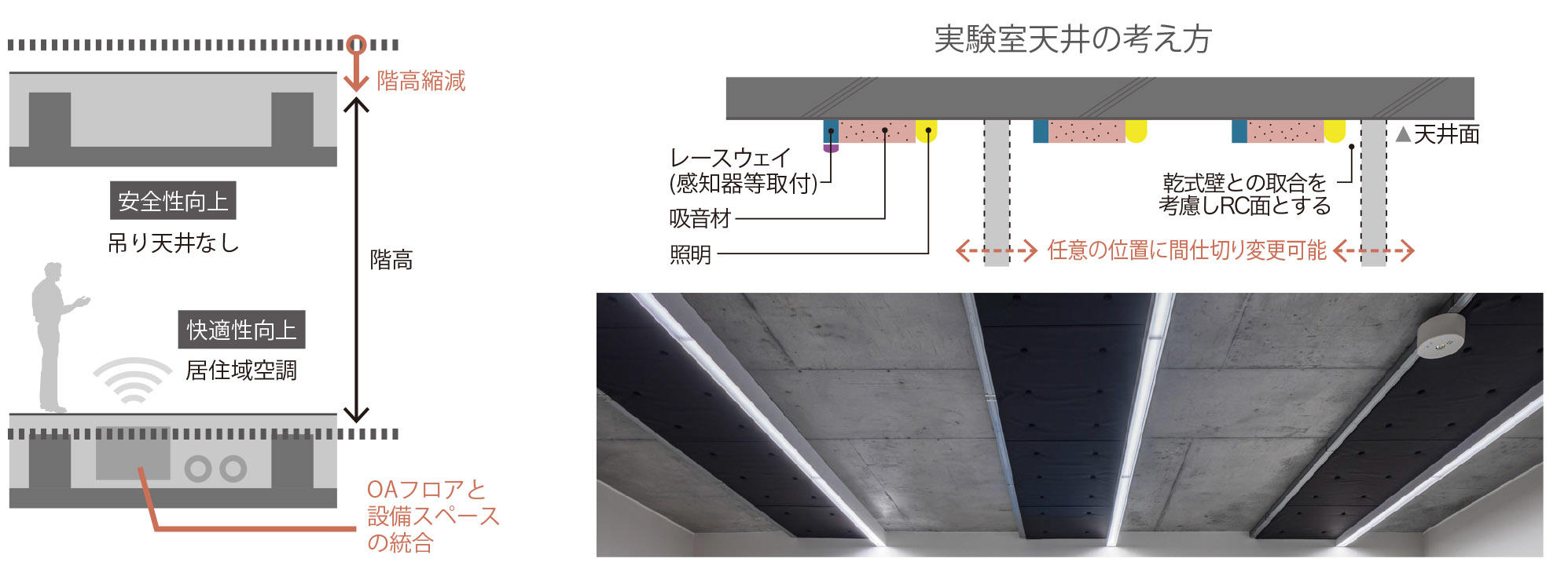 吊り天井を廃し、設備を床下に納める逆梁工法を採用。地震時の天井材の脱落を防ぎ、研究員の安全や実験機器を損壊から守ります。また負荷熱が大きい窓側には、床下から吹き出す空調システムを採用。効率的な室温維持に貢献する設計です。これらの工夫は将来、間仕切壁を変更する際にもフレキシブルに対応ができ、大規模な改修ではなく、持続可能な更新を可能にします。