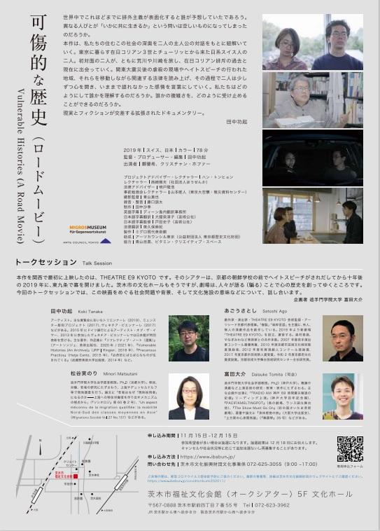 第1部では、アーティスト・田中功起氏が2019年に手がけた『可傷的な歴史(ロードムービー)』を上映。同作では、在日コリアン3世と日系スイス人のふたりの出会いと対話をもとに、荒川や川崎を旅して在日コリアン排斥の過去と現在に出会いながら、異なる背景を持つ人びとが「いかに共に生きるのか」という問いが、現実とフィクションが交差する拡張されたドキュメンタリーとして描かれている。