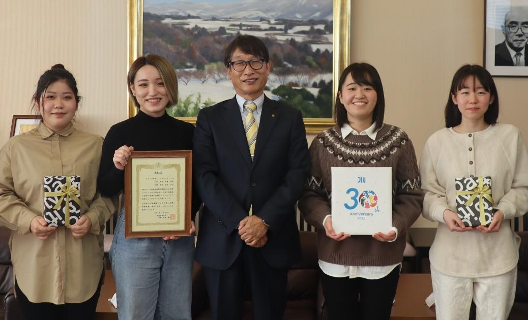 12月23日に行われた表彰式で、代表の久田さんは「大学の新たな歴史を学生全員で作っていきたいという思いから、同じコースの仲間と一緒にデザインを考えました。採用が決まってとても嬉しいです」と4名で喜びを分かち合っていました。今後、このロゴマークを創立30周年記念事業などさまざまな用途で活用し、学内外に周知していく予定です。
