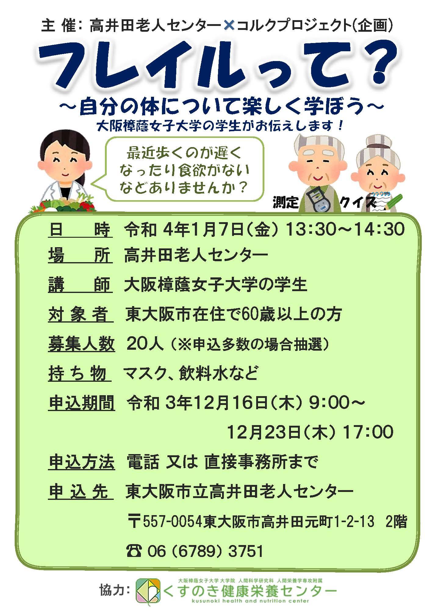 ■大阪樟蔭女子大学コルクプロジェクト×東大阪市立高井田老人センター■管理栄養士・栄養士を目指す女子大生が地域の高齢者の健康維持に貢献する企画「フレイルって?~自分の体について楽しく学ぼう~」開催