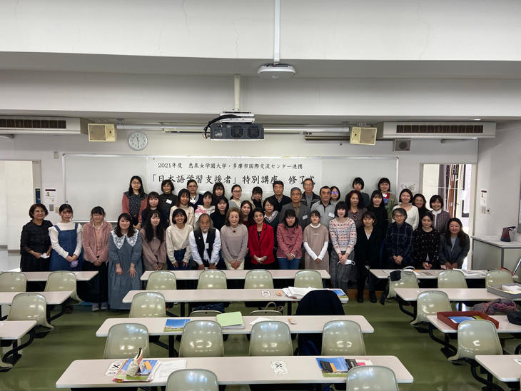 同大では、どの学科に所属していても、外国人に日本語を教える日本語教員の資格取得を目指すことができる。本講座の修了生は今後、東京都多摩市を始めとするさまざまな地域の日本語教室等で日本語学習支援者として活躍し、多文化共生や日本語教育の一助となることが期待される。