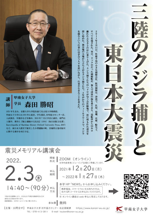 甲南女子大学(神戸市東灘区)は2022年2月3日(木)、震災メモリアル講演会「三陸のクジラ捕りと東日本大震災」をオンラインで開催します。語り手は、歴史人類学・捕鯨史を専門とする森田勝昭(もりた かつあき)学長です。