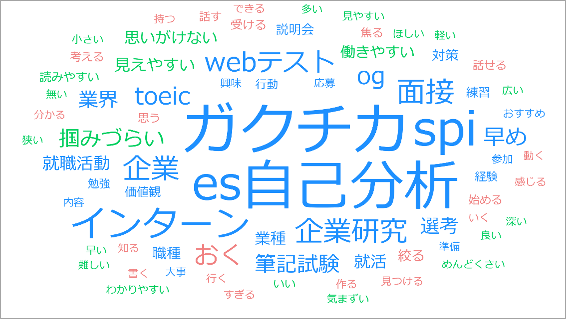 また、最も多くあげられた言葉は”ガクチカ(学生時代に力を入れたこと)”で、「違うジャンルのガクチカを3つ作って綺麗にわかりやすく話せる準備をしておくと良い」「自己分析と自分が何をしたいかは大学1年生から考えていくべき」などのアドバイスがありました。
