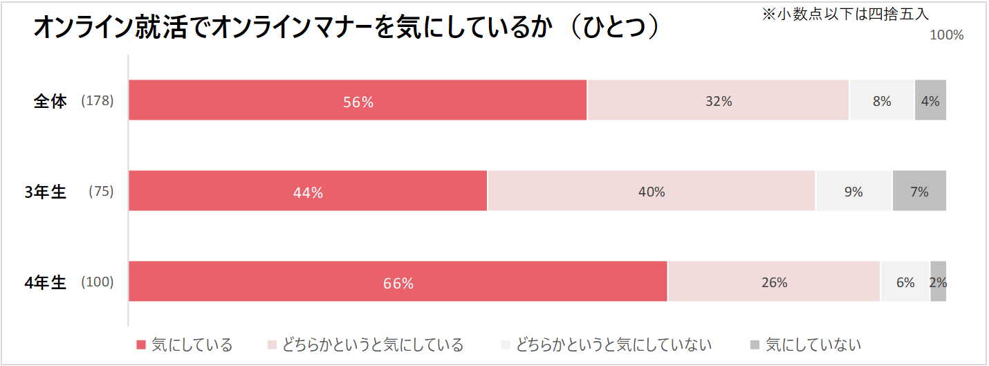 今回のアンケートでは、「オンライン就活」についても調査しました。「オンライン就活において、オンラインマナーを気にしていますか?」という質問に対して、「気にしている(56.2%)」「どちらかというと気にしている(32.0%)」と合わせて88.2%の学生がオンラインマナーを気にしていることがわかりました。学年別で見ると、「気にしている」と回答した3年次は44.0%だったのに対して、4年次は66.0%が「気にしている」と回答し、就活を一通り経験した4年次の方がオンライン就活におけるマナーを強く意識していることが明らかになりました。具体的なオンラインマナーには、「話す時は、『相手の目』ではなく『カメラ』を見て話す」「他の人が発言している時は、自分自身をミュートにして、ハウリングを避ける」などの対応があがりました。