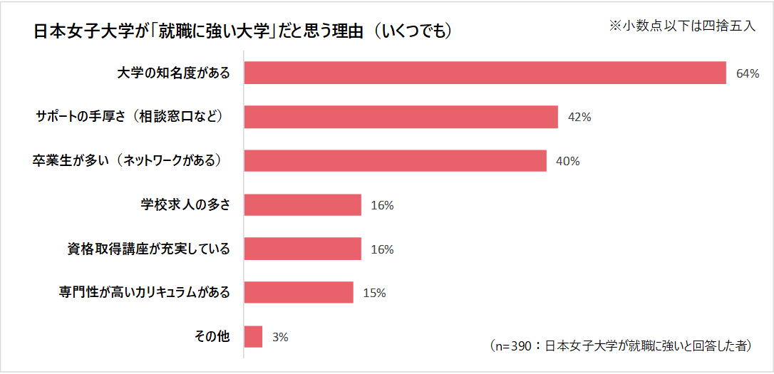最後に、「日本女子大学は就職に強い大学だと思いますか」という質問をしたところ、「そう思う(22.9%)」「どちらかというと思う(60.5%)」と合わせて83.4%の学生が「日本女子大学は就職に強い大学である」と回答しました。その理由について質問したところ、1位は「大学の知名度がある(64.1%)」、2位「サポートの手厚さ(相談窓口など)(41.8%)」、3位は「卒業生が多い(ネットワークがある)(40.3%)」という結果となりました。
