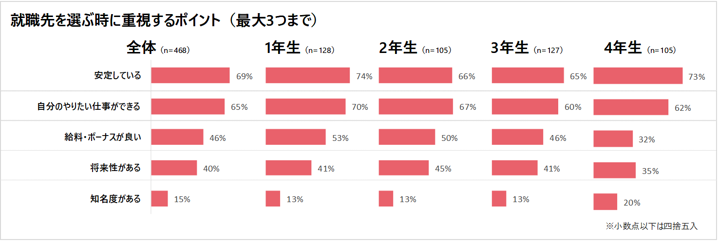 次に、「就職志望先の企業を選ぶときに重要視するポイント」を質問したところ、1位は「安定している(69.4%)」、2位は「自分のやりたい仕事ができる(65.0%)」、3位は「給料・ボーナスが良い(45.9%)」という結果となりました。学年別に見ると、1位と2位の順位はどの学年でも変わらず重要視されていることがわかりましたが、3位の「給料・ボーナスが良い」については、学年が上がるにつれて、重要度は下がっていく傾向が明らかになりました。1年次が53.1%であるのに対して、2年次は50.5%、3年次は46.5%、4年次は32.4%と、1年次と4年次を比較すると20.7%の差がみられました。