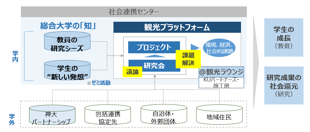 ●特徴は、“総合大学の知”と、プラットフォーム事業を産業界から推進する「神大パートナーシップ制度」の2点。第一弾として、協創空間“観光ラウンジ”を中心 に、「観光」に関する環境、 経済及び社会的課題の解決に取り組む「観光プラットフォーム」を開始