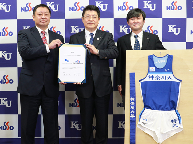 神奈川大学は、スポーツを通じた人材育成を目的に、アスレティックデパートメントを設置しています。駅伝チームや硬式野球部など7団体を指定し、アスリートとしての活躍と学業を両立した有為な人材を社会に輩出すべく、ただ勝てばよいではなく、学業をはじめ、地域に根差した活動を通じて地域社会に寄与・貢献することも求めています。日総工産株式会社は、【人を育て 人を活かす】を創業理念に掲げておられ、本学の教育理念と共通するところがあります。この度の駅伝チームへのご支援を端緒に、人づくりと地域社会への貢献に関して広くご指導をいただきながら、かつ協働してこれらに取り組んでいけることを願っております。