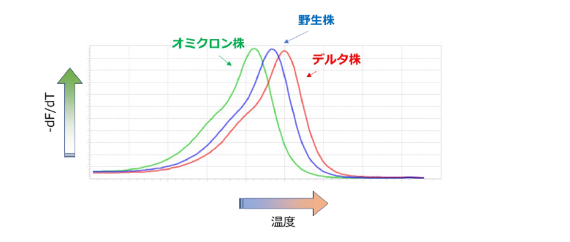オミクロン株、デルタ株に特徴的な変異を含む領域をPCRで増幅して融解曲線を測定することにより、添付画像(2)のように3つの株を容易に識別することができます。第6波の到来が懸念される中、オミクロン株によるクラスターの迅速な特定など、感染症対策への活用が期待されます。
