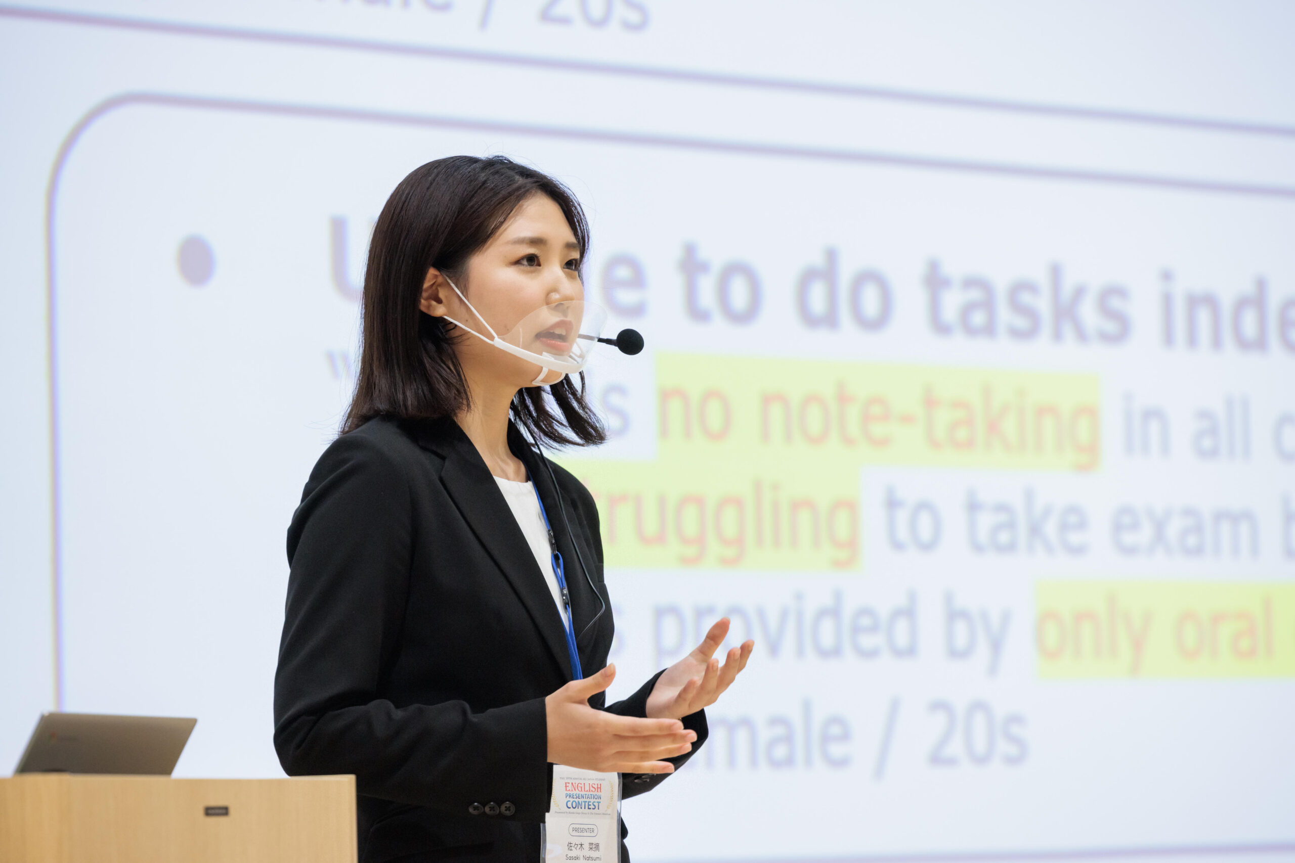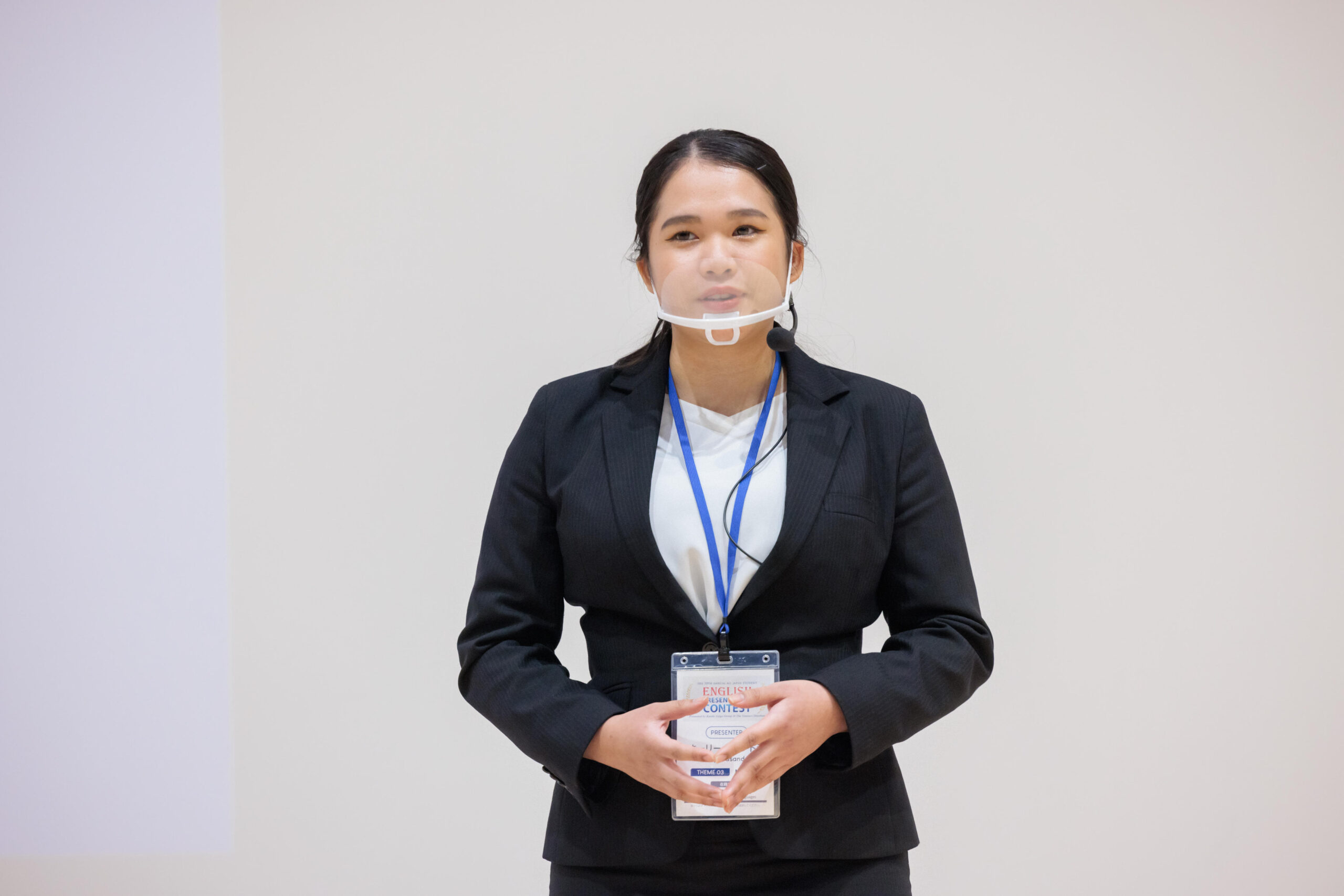 わたしたちのプレゼンテーションでは「障がい者」に焦点を当てています。わたしが中学生のとき、特別学級に通っている同級生がいて、いつも別のクラスで授業を受けていることに疑問を持っていました。そのとき感じた疑問から、障がい者と健常者を「分ける」のではなく、障がいについて理解し、ともに成長していける教育環境の構築をしたいと考え「i Hear U」を提案しました。気持ちを込めてプレゼンテーションを行ったので、最高の結果となり本当に嬉しく思います。