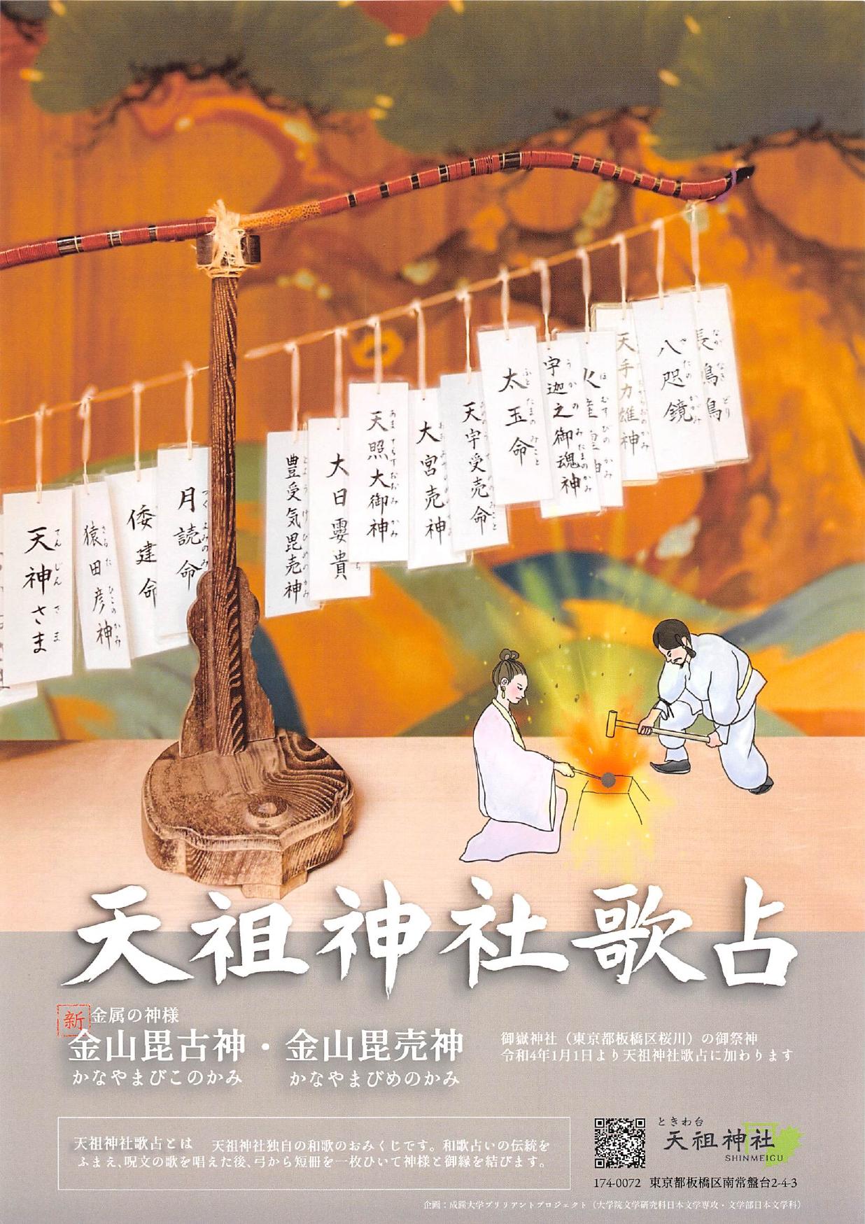 「天祖神社歌占」は、天祖神社の神々とご縁を結べる同神社オリジナルの和歌みくじです。このおみくじに関わる活動には、成蹊大学文学部日本文学科の教員(プロジェクト代表者:平野多恵教授)と学生・大学院生が協力しています。現在までに20の歌占が制作され、多くの参拝者に親しまれています。