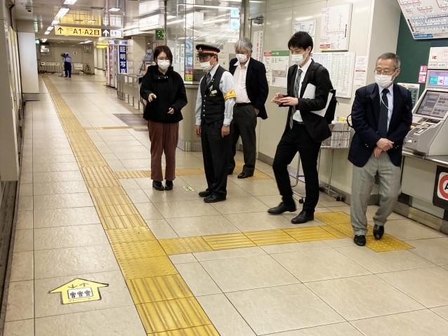 デザイン案をPC画面で見るのと実際の空間では見え方が異なり、デザイン面での課題を見つけることが出来ました。配置に関しても、小さい矢印標示はエレベータ方向への連続配置を予定していましたが、「進路の分岐箇所に置くだけでも効果がありそう」などの意見をいただき、気づきの多い設置検証になりました。実験にご協力いただきました戸越駅の駅長、交通局の皆様に感謝申し上げます。