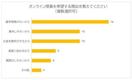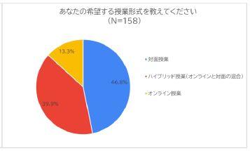 現在、オンライン授業を組み込んだ授業形式を取り入れている学校が8割近くを占める中、学生は対面授業を望んでいる傾向が見られました。その一方でオンライン授業を望む学生も多くいることが分かりました。