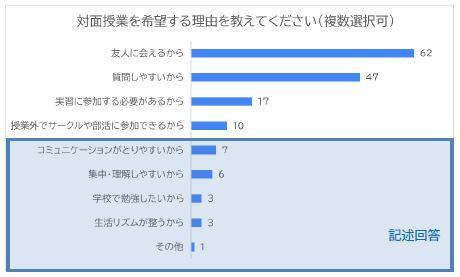一方で対面授業を希望する学生からは、コミュニケーションをとることで理解度が上がるという声が多くあり、特に実習が必要な授業や語学学習においては、雰囲気や表情から読み取るものが多いため、より授業内容を吸収できるという理由が挙げられました。