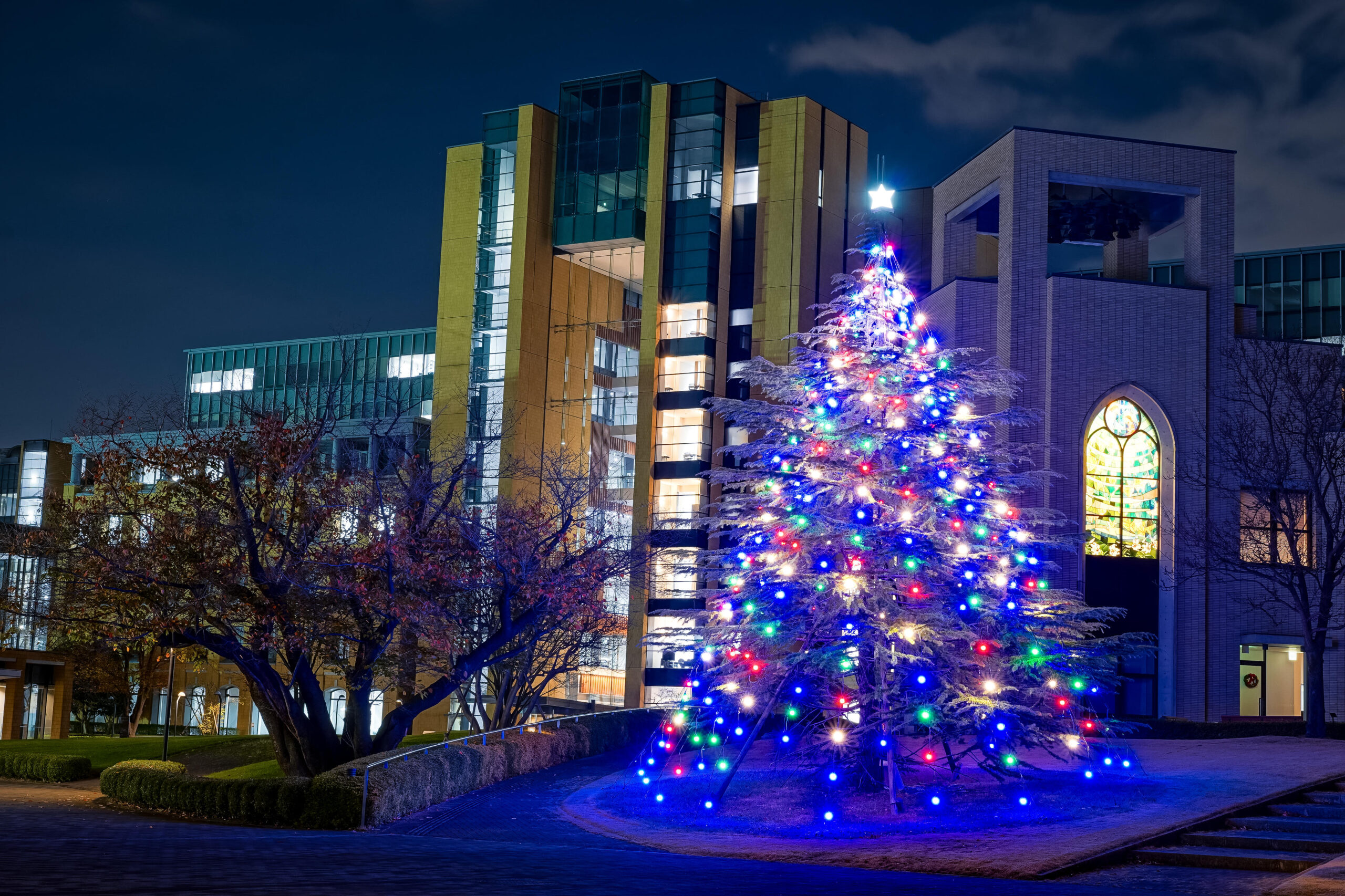 *クリスマス・ツリーの点火期間は両キャンパスとも2022年1月5日(水)まで。点灯時間は青山キャンパス16時から22時30分、相模原キャンパス16時30分から24時30分。一般の方の入構はご遠慮いただいておりますが、青山キャンパスのクリスマス・ツリーは青山通り沿い、正門の外からご覧いただけます。相模原キャンパスのクリスマス・ツリーはJR横浜線の車窓からご覧いただけます。