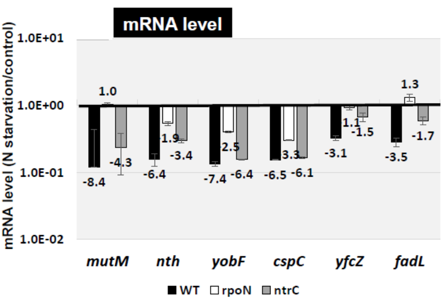 ・標的遺伝子群の多くは、定説通りに窒素欠乏によりRpoNホロ酵素およびNtrCによって発現が誘導されたが、それに対して、いくつかの標的遺伝子は抑制されることを見出した。