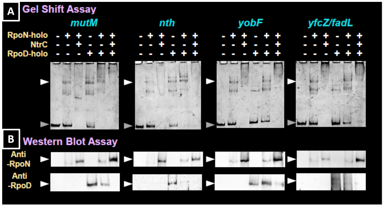 ・大腸菌のRNAポリメラーゼRpoNホロ酵素のゲノム上結合領域および標的プロモーターや標的遺伝子群の網羅的な同定に成功した。また、RpoNホロ酵素は転写の開始にエンハンサーと呼ばれる補助因子を必要としており、エンハンサーNtrCにより結合が補助される標的遺伝子群の同定にも成功した。