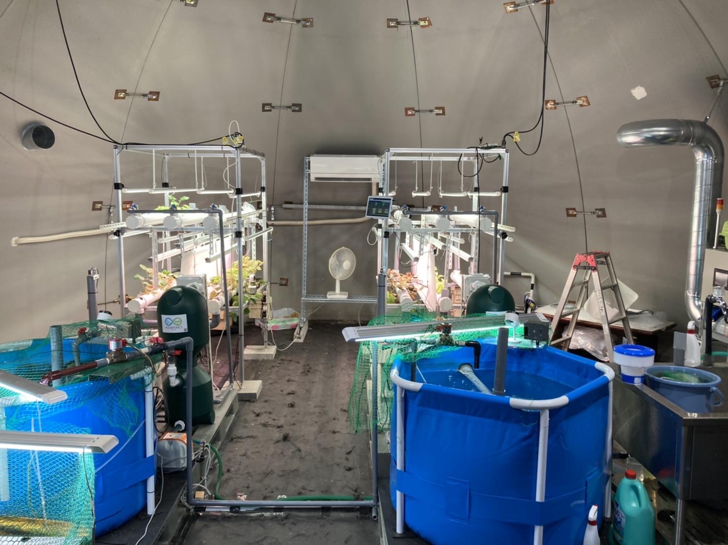 金沢工業大学白山麓キャンパスにあるドームハウス(※2)内で、2020年度からアクアポニックスの実証実験を開始しています。これまでの実証実験を通して魚の育成、野菜の栽培を安定的に行えるようになり、今後、本格的にアクアポニックスの”北陸モデル”の研究を進めていきます。