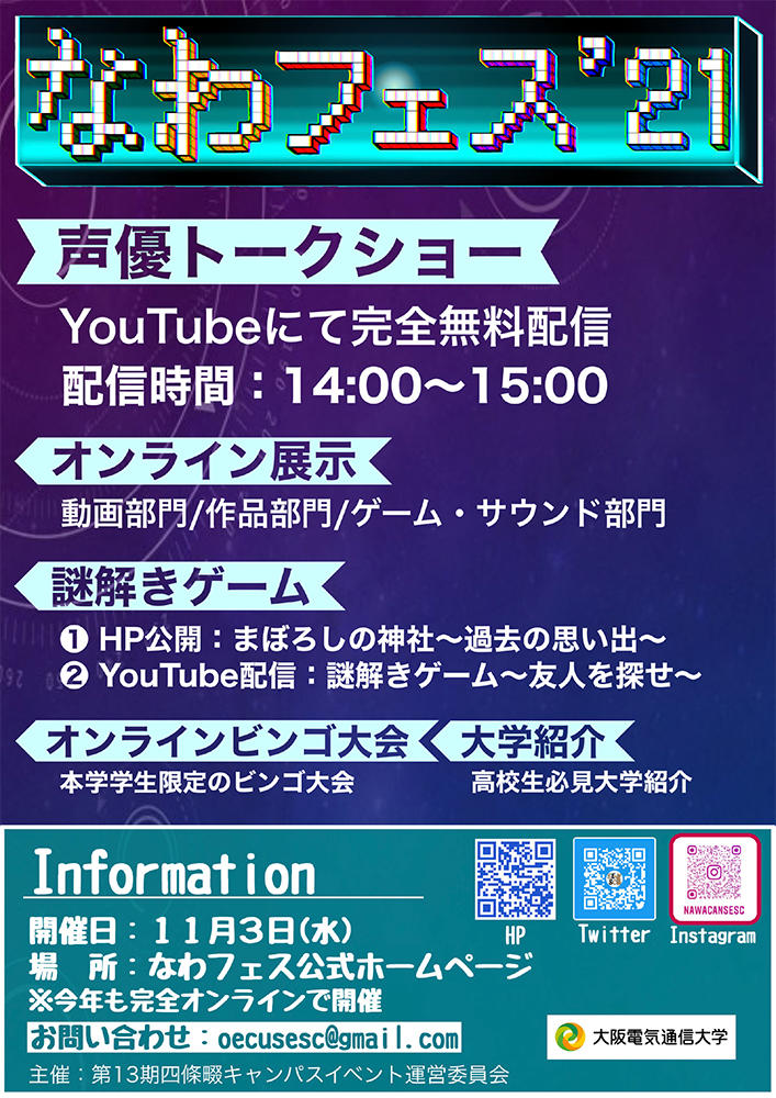 11月3日(水)に大阪電気通信大学 四條畷キャンパスの祭典「なわフェス’21」で大人気企画 声優トークショーを開催します!昨年に引き続き、今年もオンラインで無料配信!人気声優をゲストに迎え、さまざまな企画を開催します。