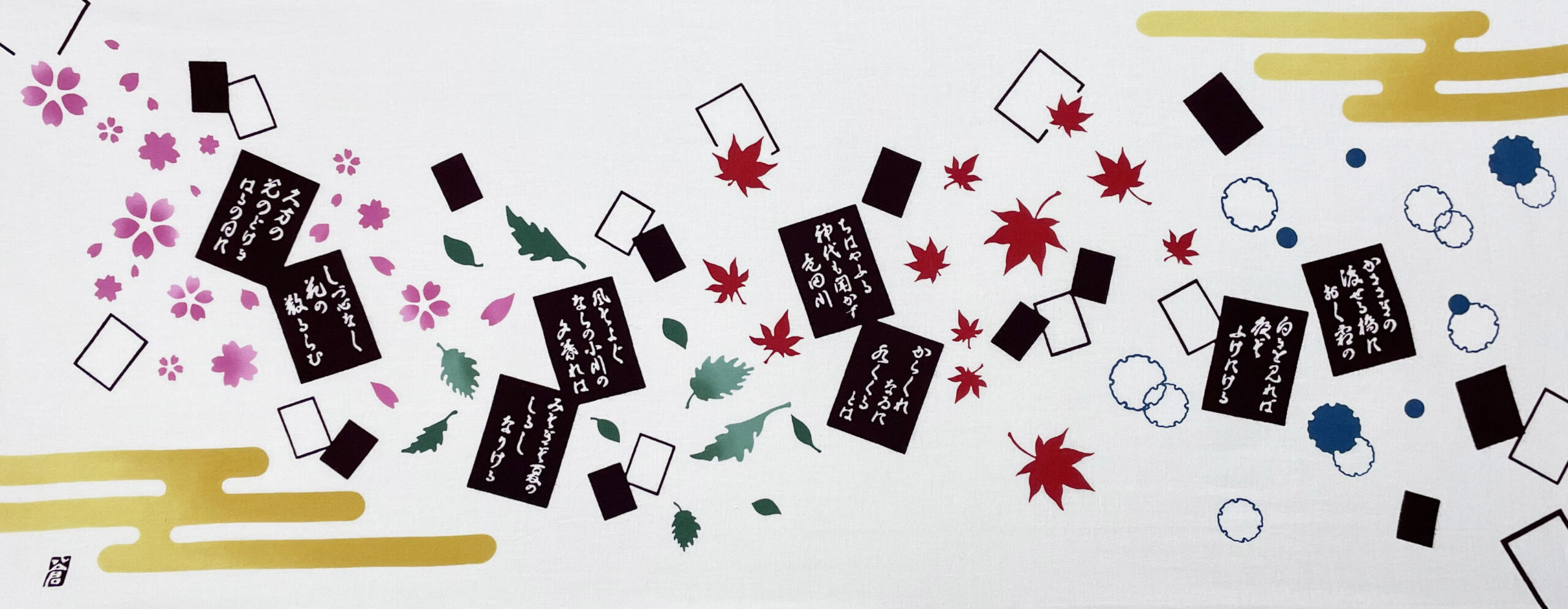 作品の絵柄は日本の四季を表現したもので、左から右にかけて春夏秋冬が推移。春の桜、夏の新緑、秋の紅葉、冬の雪が流れるように描かれ、その上に、四季それぞれに合わせて選びぬかれた百人一首の和歌が「かるた札」のかたちで散らされている。