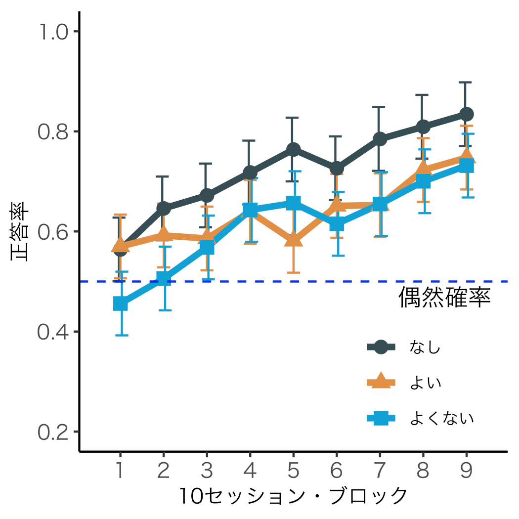 実験は、オペラント箱という装置を用いて行いました(図2)。箱の背面に設置された餌箱にマウスが頭を入れると、箱の前面のモニタ上に左右に2枚並んだ画像が提示されます。2枚のうち、右上がりの斜線を含む画像を選択すると正解で、餌が与えられます。左上がりの斜線を含む画像を選択すると不正解で、5秒間待つというペナルティが与えられます。実験の条件は、補助線なし、よい補助線、よくない補助線の3条件あり、どの条件で斜線の向きを区別するのが早く学習できるか調べました。実験は1日30試行を90日間、合計2,700試行実施しました。結果、補助線なし条件で最も早く学習が進み、補助線は、引き方にかかわらず学習を難しくしました(図3)。