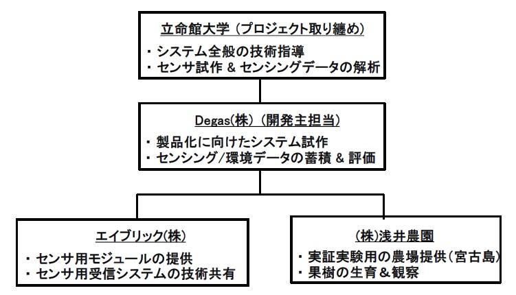 今回の実験において、立命館大学はプロジェクト管理やセンサの試作、センシングデータ解析、Degas株式会社は、システムの製品化に向けた動きや収集したデータの蓄積・評価、エイブリック株式会社は、センサ用モジュールの提供やセンサ用受信システムの技術共有、株式会社浅井農園は、実証実験用の農場提供、果樹の生育・観察を行います。