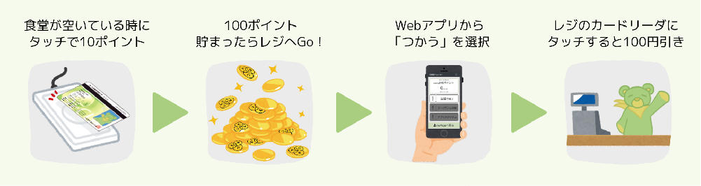 混雑度予報システムは、Bluetooth端末の検知により本学寝屋川キャンパス内の2か所の学内食堂の混雑度を測定します。また、この混雑予報を多くの学生に利用してもらうため、食堂が空いている時間帯の利用には学内食堂で利用できるポイントを付与する制度を導入しました。