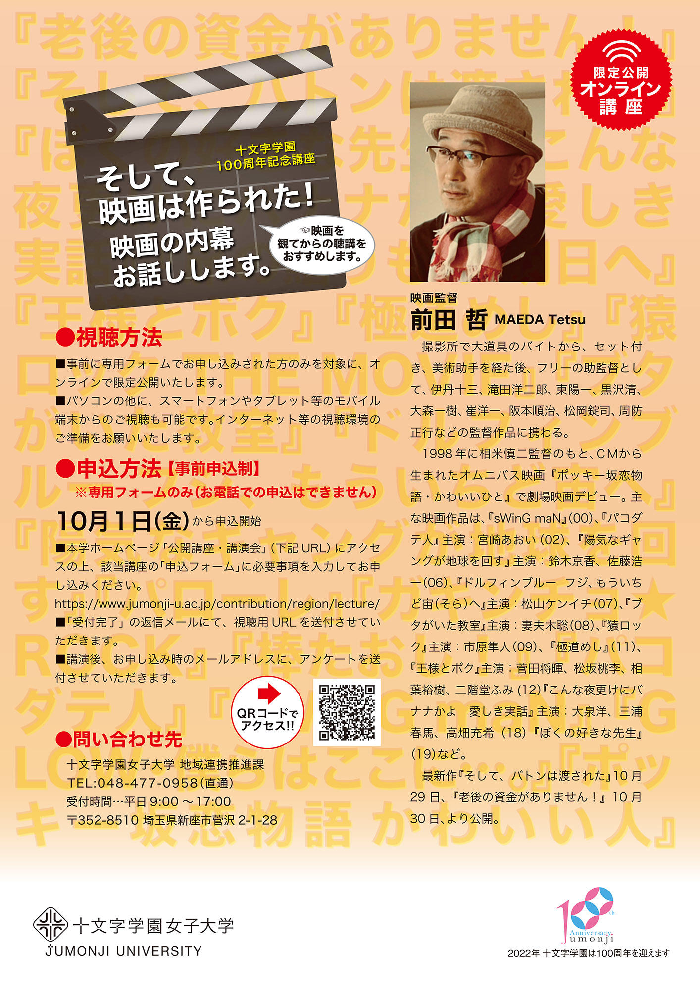 十文字学園女子大学(埼玉県新座市/学長:志村二三夫)は11月3日(水・祝)、オンライン講座「そして、映画は作られた! 映画の内幕お話しします。」を開催する。これは、2022年の十文字学園創立100周年を記念して行うもので、映画監督の前田哲氏を招請。コロナ禍での映画制作の実情や、新しい時代のエンターテインメントの展望について講演を行う。要事前申し込み、定員200名(先着順)。参加費無料。