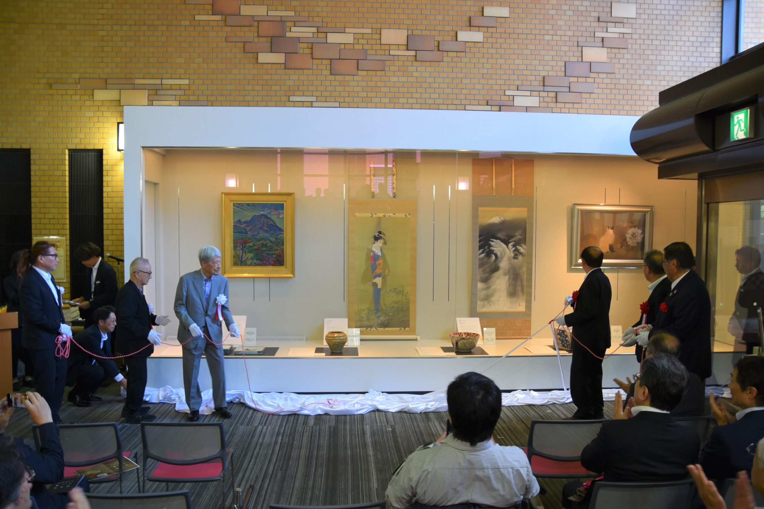 名城大学卒業生で自動車部品製造「株式会社メイドー」(本社・愛知県豊田市)の代表取締役名誉会長を務める長谷川士郎・学校法人名城大学理事会顧問が、横山大観の掛け軸や北大路魯山人の陶磁器など日本を代表する作家の貴重な美術品245点を本学に寄贈し、このうち一部の作品を展示する天白キャンパス附属図書館本館2階エントランスホールで9月26日、長谷川顧問も出席して「長谷川士郎コレクション」のオープニングセレモニーを開催しました。